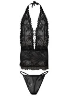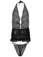 Krajková košilka s otevřenými zády. Intenzivní černá barva, sexy. Ideální pro sezónu jaro-léto, košíčky ve stylu braletky, prodloužené, zavazování za krkem. Přizpůsobená tělu, měkká a pružná krajka, měkká guma na lemu pro příjemný střih. Součástí jsou tanga. 100% polyester.