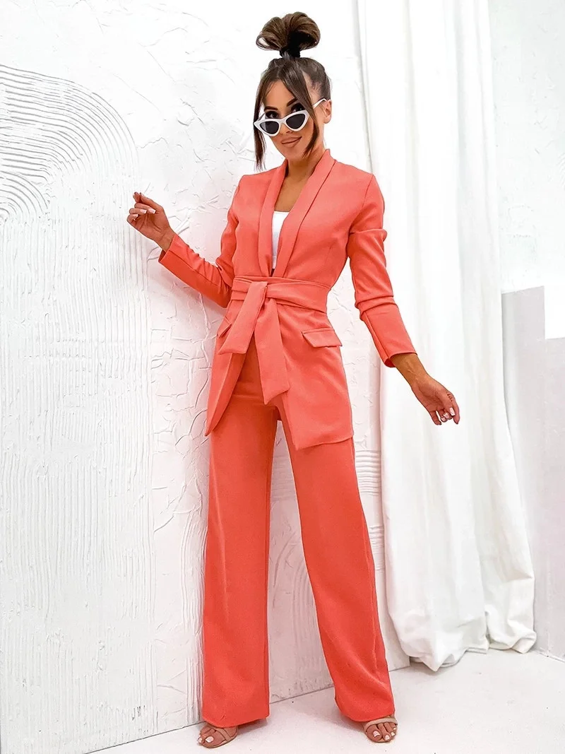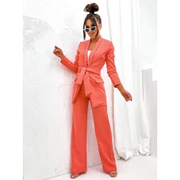 Dámský komplet v korálové barvě - volné sako a široké kalhoty (8167)