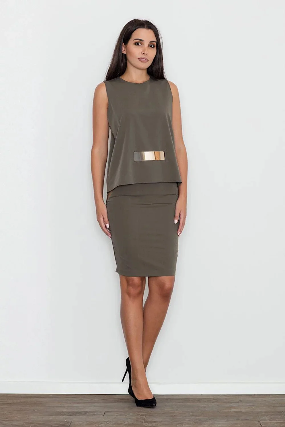 Elegantní sada v jednoduchém provedení. Halenka s ozdobným zlatým akcentem dodává eleganci a modernost. Přiléhavá sukně před kolena s vložkami z ekokůže, krytý zip. Sada je ideální pro mnoho denních i večerních příležitostí.