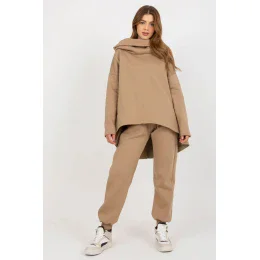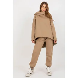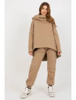 Dámská souprava sestávající z mikiny a kalhot. Halenka prodlouženého střihu s dlouhými rukávy a kapucí. Dlouhé kalhoty se zavazováním v pase a kapsami.