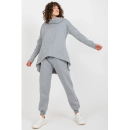 Dámská souprava sestávající z mikiny a kalhot. Halenka prodlouženého střihu s dlouhými rukávy a kapucí. Dlouhé kalhoty se zavazováním v pase a kapsami.