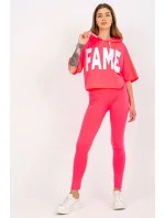 Tepláková souprava sestávající z mikiny a legín. Volná mikina s krátkými rukávy a kapucí. Dlouhé legíny se širokým elastickým pasem. Souprava s ozdobnými nápisy.