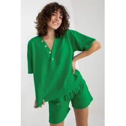 Tepláková souprava sestávající z halenky a šortek. Halenka s krátkými rukávy a výstřihem do V. Šortky se zavazováním v pase a kapsami.