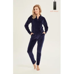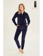 Dámská tepláková souprava z hřejivého veluru. Halenka s dlouhými rukávy, stojáčkem a nápadným rozparkem ve tvaru V. Dlouhé kalhoty s praktickými kapsami na bocích, v pase pohodlná guma. Ideální jako sportovní oblečení i jako součást každodenního outfitu. Tepláková souprava je lehká, prodyšná a zároveň hřejivá.