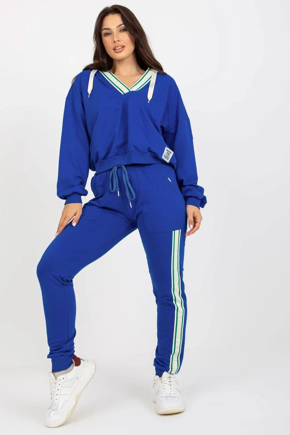 Tepláková souprava sestávající z mikiny a kalhot. Mikina s dlouhými rukávy a kapucí. Dlouhé kalhoty se zavazováním v pase a nakládanými kapsami.