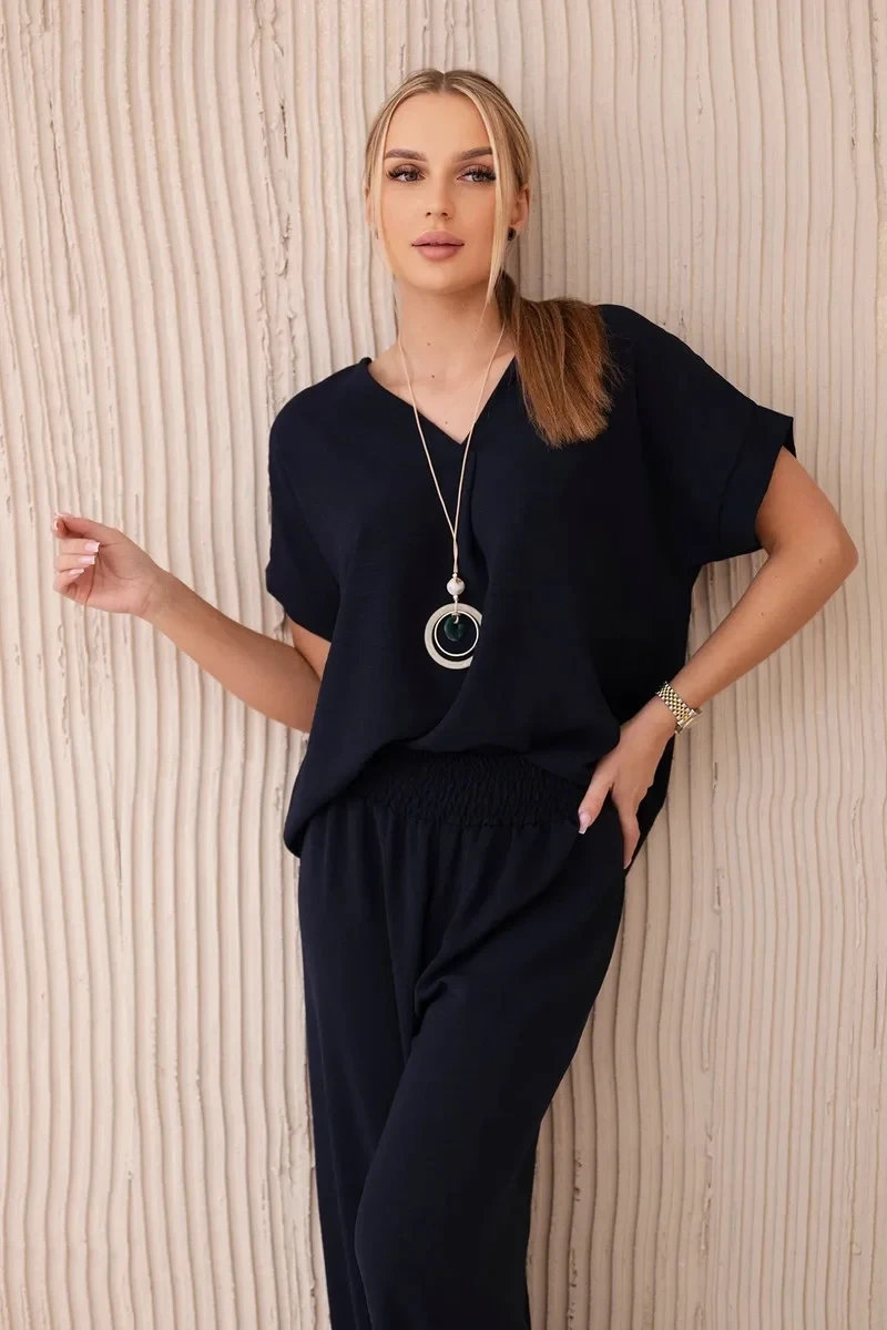 Komplet s náhrdelníkem halenka + kalhoty námořnická modř