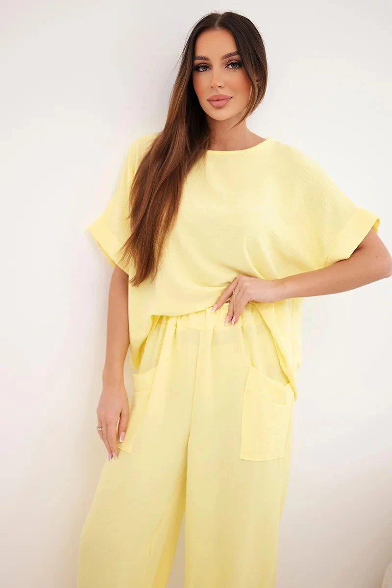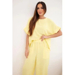 Objevte jedinečný komplet vyrobený z prodyšné a jemné viskózy, který kombinuje styl a pohodlí při nošení. Halenka s klasickým střihem skvěle padne na postavu, zajišťuje volnost pohybu a elegantní vzhled. Díky lehké tkanině je velmi příjemná na pokožce a ideální pro každé roční období. Kalhoty, navržené s důrazem na pohodlí, mají elastický pas a volnější střih, což zajišťuje skvělé přizpůsobení postavě. Jedná se o univerzální soupravu, která se skvěle hodí jak pro každodenní outfity, tak pro elegantnější příležitosti. Zvolte komplet z viskózy, pokud si ceníte lehkosti, přírodních tkanin a moderního vzhledu. Perfektní volba pro ženy, které se chtějí cítit stylově a pohodlně po celý den. Velikost je univerzální a vhodná pro ženy nosící velikost S, M nebo L.