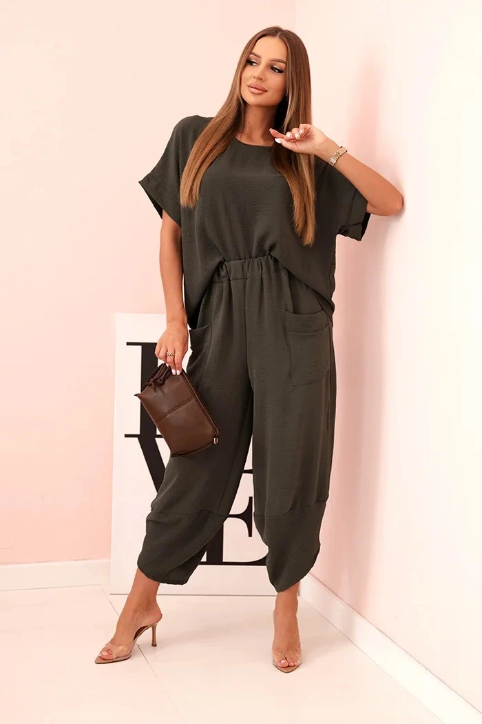 Komplet z viskózy halenka + kalhoty khaki