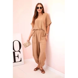 Objevte jedinečný komplet vyrobený z prodyšné a jemné viskózy, který kombinuje styl a pohodlí při nošení. Halenka s klasickým střihem skvěle padne na postavu, zajišťuje volnost pohybu a elegantní vzhled. Díky lehké tkanině je velmi příjemná na pokožce a ideální pro každé roční období. Kalhoty, navržené s důrazem na pohodlí, mají elastický pas a volnější střih, což zajišťuje skvělé přizpůsobení postavě. Jedná se o univerzální soupravu, která se skvěle hodí jak pro každodenní outfity, tak pro elegantnější příležitosti. Zvolte komplet z viskózy, pokud si ceníte lehkosti, přírodních tkanin a moderního vzhledu. Perfektní volba pro ženy, které se chtějí cítit stylově a pohodlně po celý den. Velikost je univerzální a vhodná pro ženy nosící velikost S, M nebo L.