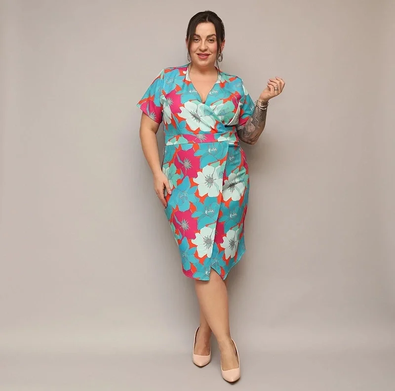 Zeleno-oranžové přeložené obálkové dámské květované šaty v délce ke kolenům (742)