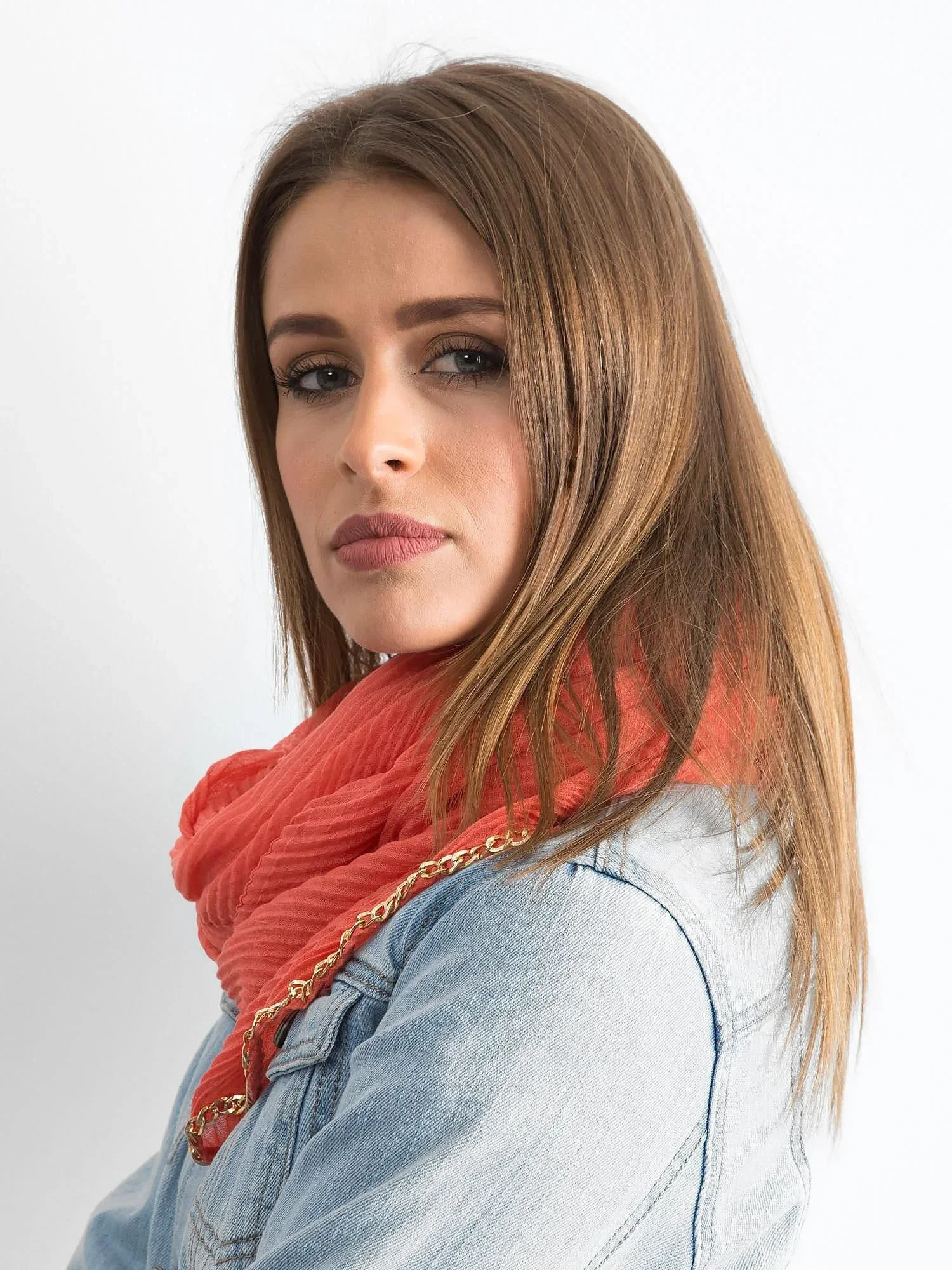 Řetízková šála v korálové barvě.