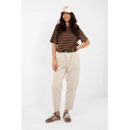 Kalhoty z kordonu typu carrot jsou pohodlným a stylovým návrhem pro každodenní i kancelářské stylizace v uvolněném, ležérním provedení. Vyrobené z kombinace bavlny s přídavkem elastanu zajistí pohodlí nošení, pružnost a dobré přizpůsobení postavě. Hladký vzor a sevřené nohavice délky 7/8 dodávají celku moderní charakter. Model s vysokým pasem, s elastickým pásem v pasu, zaručuje pohodlí po celý den a navíc je vybaven zapínacím páskem, který zdůrazňuje pas. Boční kapsy zvyšují funkcionalitu kalhot. Absence klasického zapínání způsobuje, že kalhoty jsou snadno nasazovatelné a skvěle se hodí jak do každodenních outfitů, tak do pracovních stylizací.