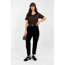 Kalhoty ze žíněného žínění typu mrkev jsou pohodlným a stylovým návrhem pro každodenní i pracovní stylizace v uvolněném, neformálním provedení. Vyrobené z kombinace bavlny s přídavkem elastanu poskytují pohodlí nošení, pružnost a dobře padnou k postavě. Hladký vzor a zúžené nohavice s délkou 7/8 dodávají celku moderní charakter. Model s vysokým pasem a elastickým páskem zapuštěným v pasu zaručuje pohodlí po celý den a je navíc vybaven zapínacím páskem, který zdůrazňuje pas. Boční kapsy zvyšují funkčnost kalhot. Absence klasického zapínání zajišťuje, že kalhoty jsou snadno nasazovatelné a skvěle se hodí jak do každodenních outfitů, tak do pracovních stylizací.