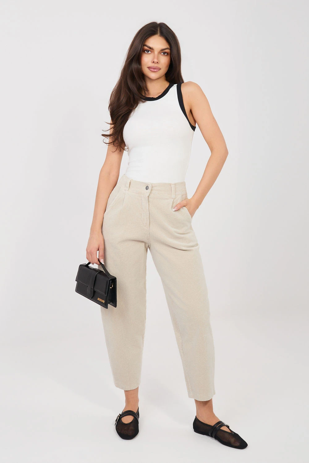 Moderní dámské žíněrové kalhoty typu mrkev, které spojují pohodlí s nadčasovým, ležérním stylem. Jsou ideální volbou na každý den a hodí se jak do městských outfitů, tak do pracovních kombinací. Model je vyroben z vysoce kvalitní bavlny s přídavkem elastanu, co zajišťuje pohodlné nošení a jemnou pružnost materiálu. Hladký vzor podtrhuje univerzální charakter kalhot, zatímco žíněrová struktura jim dodává módní, lehce retro nádech. Kalhoty mají vysoký pas, který krásně zdůrazňuje pas a opticky prodlužuje postavu. Střih mrkev s sevřenými nohavicemi poskytuje volnost v bocích a stehnech a zároveň celku dodává moderní tvar. Zapínání na zip a knoflík zaručuje pohodlí a stabilní přizpůsobení. Praktické boční kapsy zvyšují funkčnost modelu. Je to skvělá volba pro ženy, které ocení pohodlí, styl a všestrannost ve svých každodenních outfitech.
