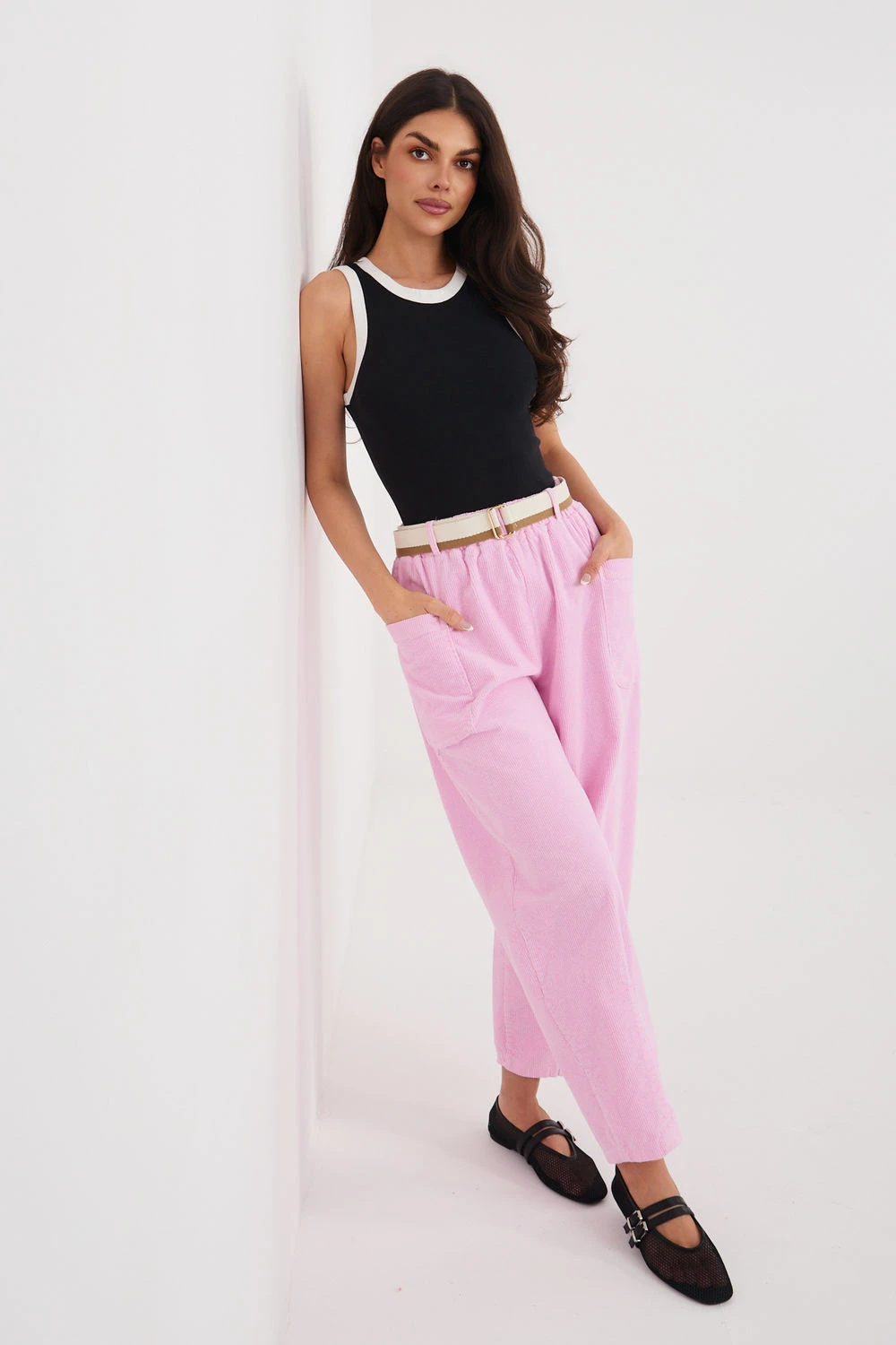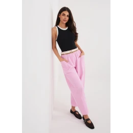 Stylové dámské šedé kalhoty vyrobené ze žíně jsou skvělým návrhem pro každodenní, neformální stylizace. Střih typu mrkev je charakterizován uvolněnější formou v oblasti boků a se zúženými nohavicemi, co zajišťuje pohodlí nošení a moderní vzhled. Model s vysokým pasem krásně zdůrazňuje pas a opticky prodlužuje postavu. V pase je vsazena elastická guma, která zaručuje pohodlné přizpůsobení bez nutnosti zapínání. Další výhodou je zapínací pásek, který zdůrazňuje pas a představuje stylový prvek dokončení. Kalhoty nemají klasické zapínání, co zvyšuje pohodlí používání. Jsou vybaveny otevřenými, vsunutými kapsami nasazenými po stranách, praktickými a dodávajícími celku ležérní charakter. Vyrobena z vysoce kvalitní směsi bavlny a elastanu, jsou měkké, příjemné na dotek a jemně pružné, díky čemuž se dobře přizpůsobují postavě. Hladký vzor dělá model univerzálním a snadno kombinovatelným, ideální na každý den, do práce nebo na schůzku.