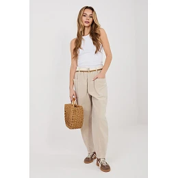 Stylové dámské kalhoty vyrobené ze žíně jsou skvělým návrhem pro každodenní, casualové stylizace. Střih typu carrot je charakterizován volnější formou v oblasti boků a se zužujícími se nohavicemi, co zajišťuje pohodlí při nošení a moderní vzhled. Model s vysokým pasem krásně zdůrazňuje pas a opticky prodlužuje postavu. V pasu je vsazena elastická guma, která zaručuje pohodlné přizpůsobení bez nutnosti zapínání. Další výhodou je zapínací pásek, který zdůrazňuje pas a je stylovým prvkem dokončení. Kalhoty nemají klasické zapínání, co zvyšuje pohodlí použití. Jsou vybaveny otevřenými, vsunutými kapsami nasazenými po stranách, praktickými a dodávajícími celku uvolněný charakter. Vyrobené z vysoce kvalitní směsi bavlny a elastanu jsou měkké, příjemné na dotek a jemně elastické, díky čemuž se dobře přizpůsobují postavě. Hladký vzor zajišťuje, že model je univerzální a snadno se stylizuje, ideální na každý den, do práce nebo na schůzku.