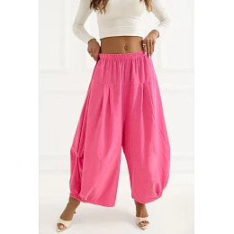 Dámské sametové kalhoty volného střihu typu aládky, ideální na každý den. Vyrobené z měkké a příjemné bavlny, zajistí pohodlí nošení a prodyšnost. Model s vysokým pasem a vsazeným gumou, která se přizpůsobí postavě a zaručí pohodlí po celý den. Široké nohavice délky 7/8 dodávají celku lehkost a moderní charakter. Kalhoty v jednoduchém vzoru, bez zapínání a kapes, co podtrhuje jejich minimalistický styl a uvolněný, nenáročný look.