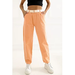 Kalhoty dámské ze žíněné látky s módním střihem typu mrkev, ideální na každý den. Vyrobené z vysoce kvalitní směsi bavlny s přídavkem elastanu, zajistí pohodlí, pružnost a dobře se přizpůsobí postavě. Model s vysokým pasem a vsazenou gumou v pasu zaručuje pohodlné nošení, zatímco dodatečný zapínací pás zdůrazňuje pas a přidává stylový dojem. Zúžené nohavice délky 7/8 dodávají celkovému vzhledu moderní charakter a opticky prodlužují nohy. Kalhoty v hladkém vzoru s praktickými bočními kapsami jsou spojením funkčnosti s minimalistickou estetikou.