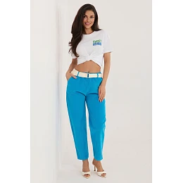 Dámské nohavice ze štruksu v moderním střihu typu carrot, ideální na každý den. Vyrobené z vysoce kvalitní směsi bavlny s přídavkem elastanu, poskytují pohodlí, pružnost a dobře sedí na postavě. Model s vysokým pasem a vsazenou elastickou gumou zaručuje pohodlné nošení, zatímco další zapínací pásek zdůrazňuje pas a dodává styl. Zúžené nohavice délky 7/8 dodávají celku moderní charakter a opticky prodlužují nohy. Nohavice v hladkém vzoru, vybavené praktickými bočními kapsami, spojují funkčnost s minimalistickou estetikou.
