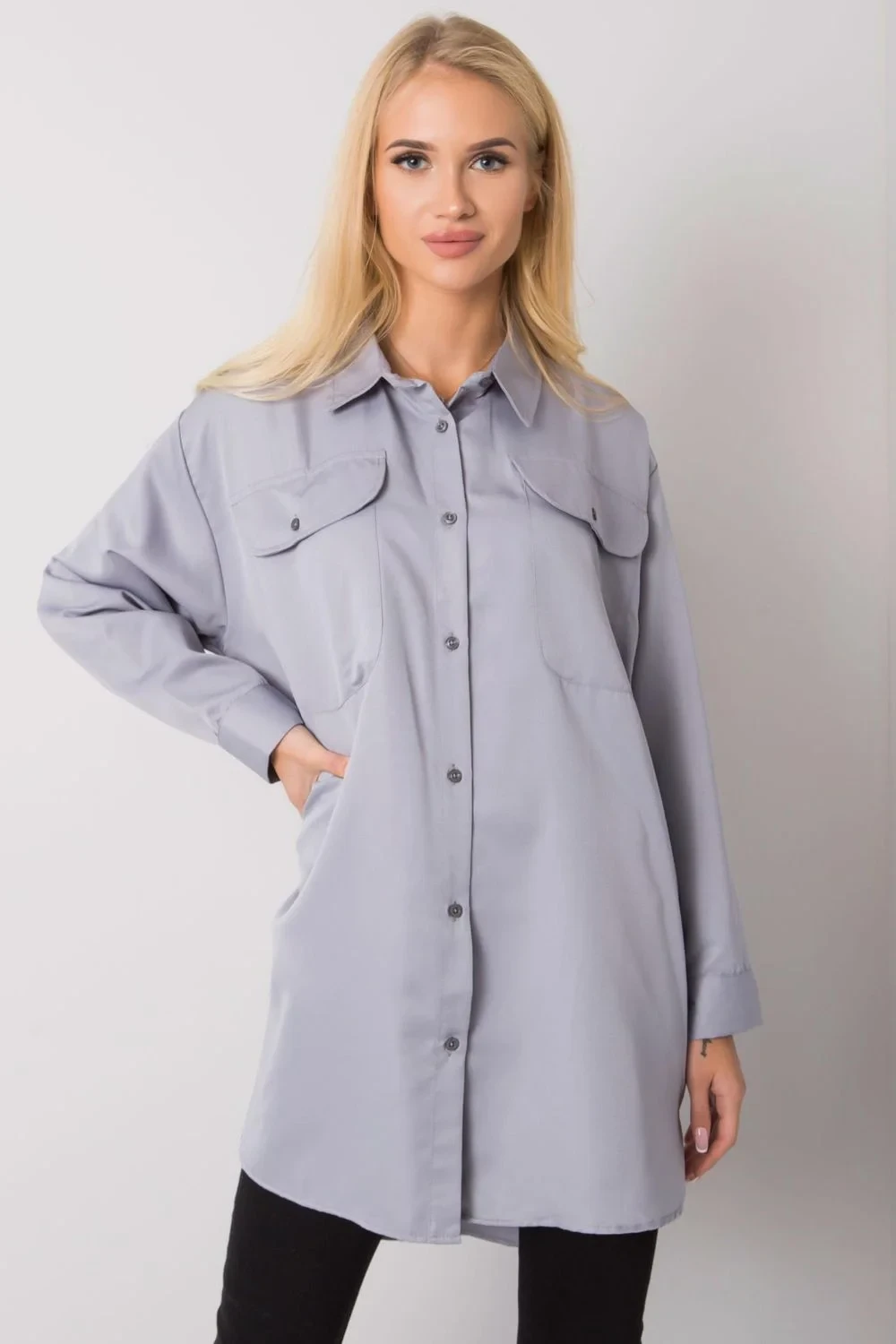 Šedé bavlněné dámské tričko s prodlouženým střihem. Košile má zapínání na knoflíky. Kapsy na přední straně. Ideální pro mnoho příležitostí.