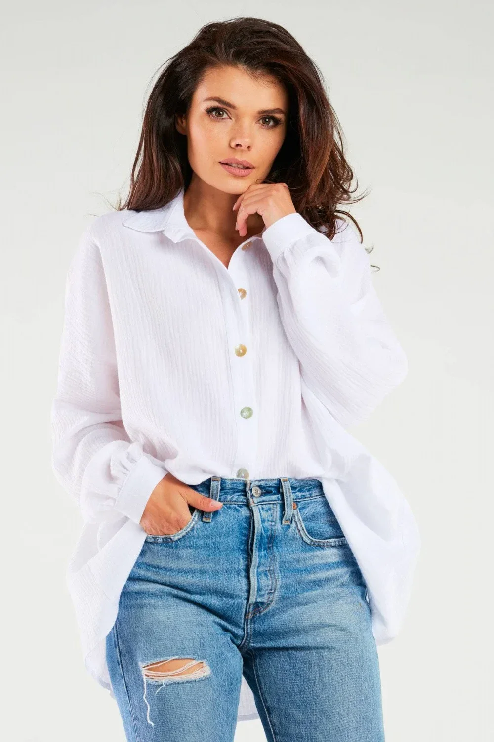 Košile nadměrné velikosti je skutečným must have v ženském šatníku. Model se zapínáním na knoflíky umožňuje upravit hloubku výstřihu podle vašich preferencí. Volný střih zakryje drobné nedostatky postavy a je skvělou alternativou ke klasické košili.