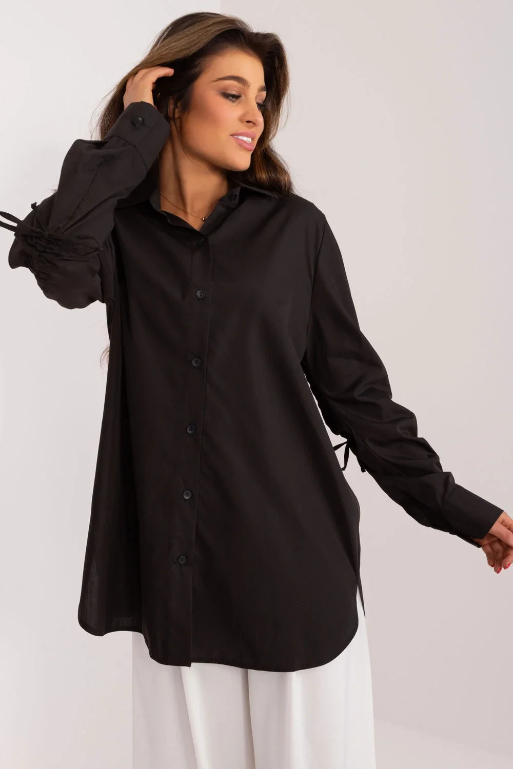 Ležérní košile s ozdobným žebrováním na rukávech je jedinečným kouskem oblečení, který kombinuje pohodlí s módním vzhledem. Tato košile je ideální pro každodenní situace i do práce a vyznačuje se pečlivě promyšleným střihem, který klade důraz na ležérní a stylové nošení. Ležérní styl dodává košili lehkost, takže je ideální volbou pro každodenní vycházky nebo schůzky. Ozdobné žebrování na rukávech dodává jedinečný nádech a vnáší do oblečení prvek originality. Převládající vzor má hladký povrch, díky čemuž je košile univerzální a snadno kombinovatelná s různými kousky oblečení. Je vyrobena převážně z bavlny, zaručuje pohodlí a prodyšnost a dokonale se přizpůsobí každodennímu životnímu tempu. Dlouhé rukávy s ozdobným žebrováním a límečkem podtrhují moderní design košile a zároveň zachovávají ležérní charakter ležérního stylu. Zapínání na knoflíky usnadňuje oblékání košile a zároveň umožňuje upravit výstřih podle vašich představ. Ležérní košile s ozdobnými žebrovanými manžetami je určena pro ženy, které ocení stylové a pohodlné řešení svého každodenního oblečení. Nejenže dodá výraz ležérnímu stylingu, ale také vám umožní vyjádřit vlastní styl a originalitu.