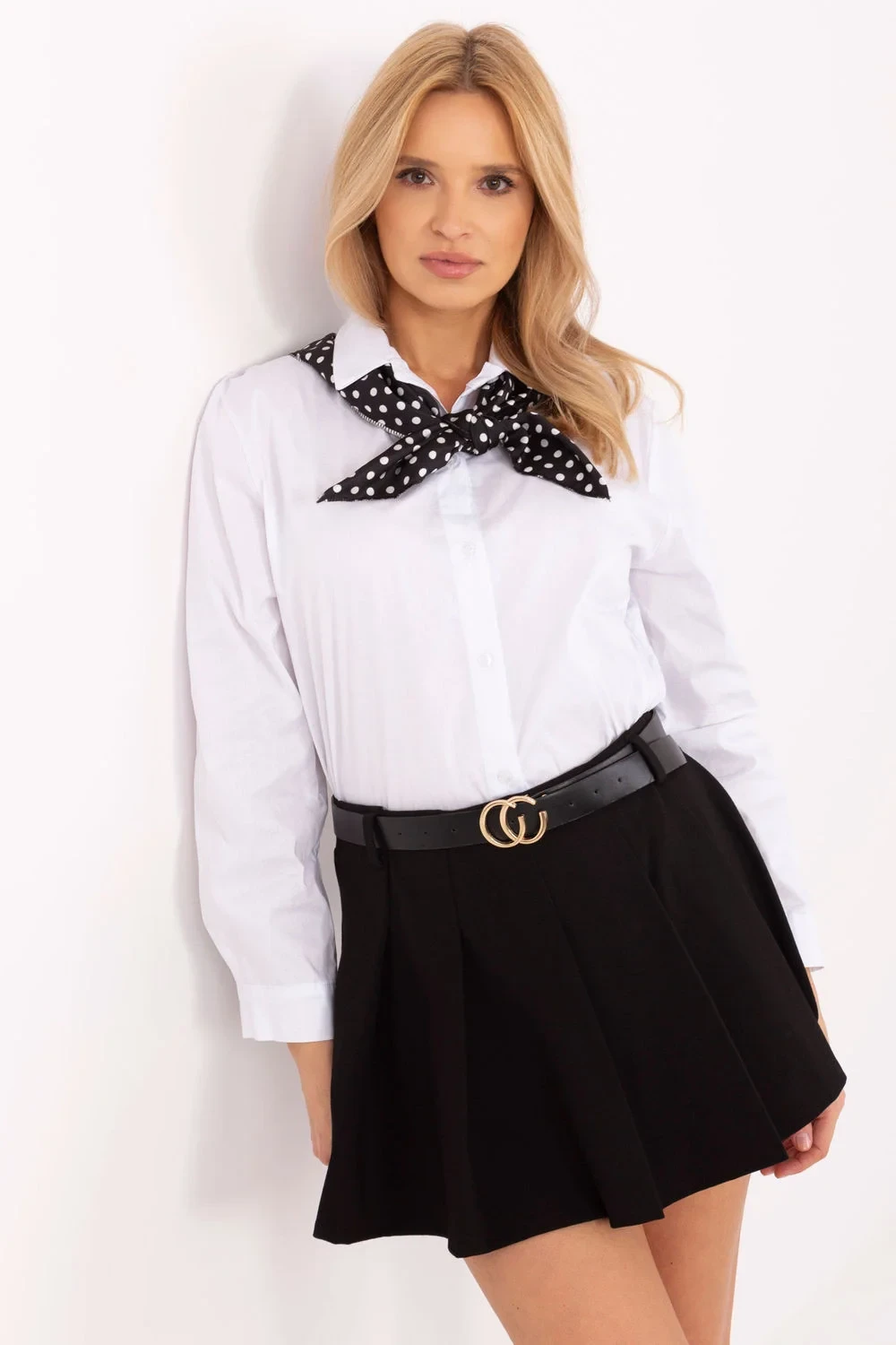 Elegantní dámská košile s klasickým střihem, ideální na společenské události, do práce nebo na každý den, kdy chcete vypadat stylově a profesionálně. Košile je vyrobena z vysoce kvalitní bavlny s přídavkem elastanu, co zaručuje pohodlí nošení a perfektní přizpůsobení. Model s klasickým límečkem a zapínáním na knoflíky je esencí nadčasové elegance. Dlouhý rukáv z ní dělá skvělý kousek na každou roční dobu. Hladká faktura materiálu jí dodává minimalistický šarm, který lze snadno sladit s různými styly. Výjimečným prvkem je odnímatelný šátek, který umožňuje jemné zkombinování outfitu. Můžete ho nosit podle příležitosti, s šálkem pro elegantnější efekt nebo bez něj pro jednodušší vzhled. Jedná se o skvělý návrh pro ženy, které oceňují klasiku s nádechem všestrannosti.