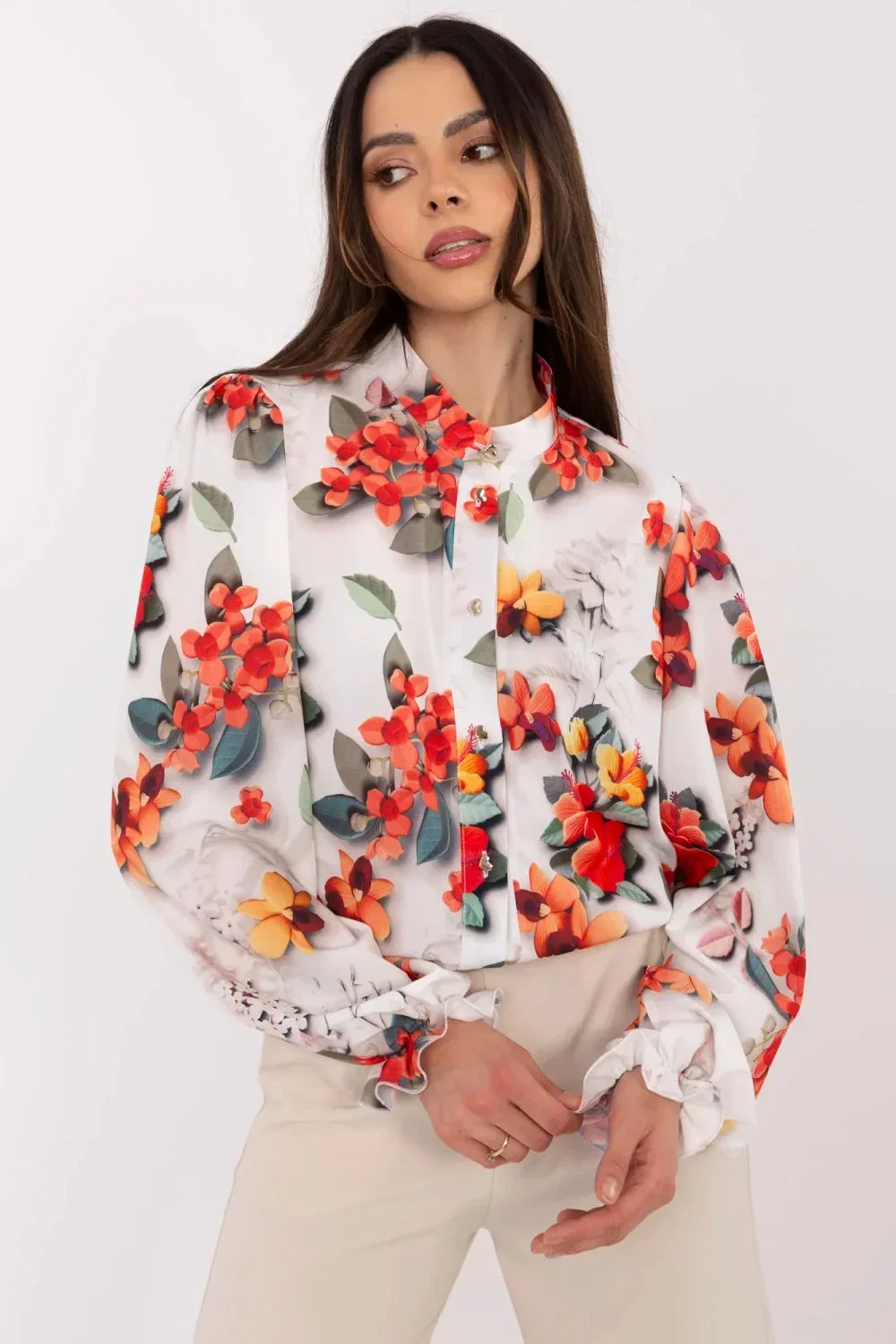 Jedinečná dámská košile s elegantním charakterem, ideální na práci i na slavnostní příležitosti. Vyrobena z vysoké kvality směsi bavlny, polyesteru a elastanu, spojuje pohodlné nošení a bezchybný vzhled. Jemný květinový vzor jí dodává ženský šarm a propracované detaily, jako je nafouklý rukáv zakončený decentním volánem a klasický stojáček, zdůrazňují stylový vzhled. Standardní délka a zapínání na knoflíky z ní dělají skvělý doplněk jak k elegantním kalhotám, tak k sukní. Je to nadčasová nabídka pro ženy, které oceňují eleganci s nádechem romantiky.