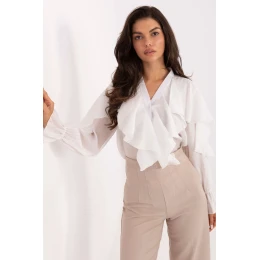 Klasická dámská košile v elegantním stylu, ideální na každý den, do práce a na slavnostní příležitosti. Vyrobena z kombinace lyocellu a polyesteru, spojuje v sobě pohodlí, lehkost a odolnost. Model s standardní délkou s výstřihem do šířky a knoflíkovým zapínáním byl obohacen o efektní záhyby a jemné volány vpředu, které dávají celku ženský, stylový charakter. Dlouhé rukávy s volánem na konci zdůrazňují eleganci a jedinečnost tohoto návrhu.