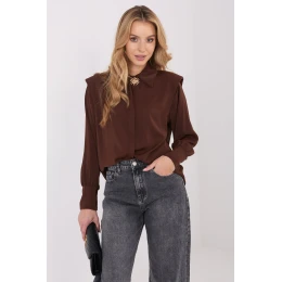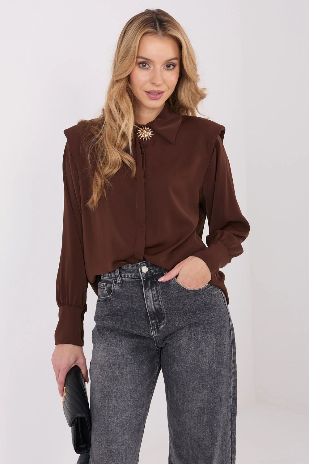 Tato stylová košile je kvintesencí elegance spojené s každodenním pohodlím. Vyrobená z vysoce kvalitní směsi viskózy, polyesteru a elastanu poskytuje pohodlí nošení, hladkou fakturu a skvělé přizpůsobení postavě. Klasický límec a zapínání na knoflíky skryté pod listem jí dodávají mimořádně uklizený, nadčasový charakter, ideální jak do kanceláře, tak na formální události. Dlouhý, lehce nafouklý rukáv dodává košili ženský výraz a jemnou eleganci. Dalším akcentem je jemný brož, který zdůrazňuje elegantní styl a odlišuje košili od ostatních klasických modelů. Standardní délka z ní činí skvělý vzhled jak zasunutou do kalhot či sukně, tak volně nošenou. Univerzální, elegantní a neuvěřitelně ženská, skvělá volba na každý den, kdy chcete vypadat profesionálně a stylově.