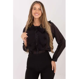 Elegantní klasická dámská košile, ideální na každý den, do práce a na více formální události. Vyrobená z vysoce kvalitní směsi tencelu a polyesteru, co zajišťuje měkkost, lehkost a pohodlí při nošení a zároveň dodává košili elegantní a klasický vzhled. Model standardní délky je zdoben hladkým vzorem, který podtrhuje její nadčasový styl. Kulatý výstřih decentně zdůrazňuje krk, a přední část je ozdobena žabotem spojeným s límečkem, vyrobeným ze stejného materiálu jako žabot, což přidává košili výjimečnou jemnost a eleganci. Košile má dlouhé rukávy s manžetou a zapínání na knoflíky, co podtrhuje její klasický charakter a usnadňuje sladění se stylizací. Toto je nabídka pro ženy, které oceňují eleganci spojenou s pohodlím a decentními dekorativními detaily v každodenním i formálním oblečení.