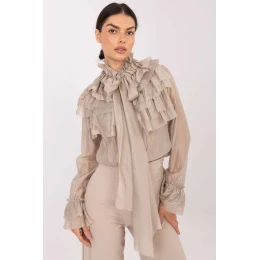 Elegantní dámská košile s límečkem, klasický model ideální na každý den, do práce a na slavnostní příležitosti. Vyrobená z vysoce kvalitní směsi tencelu a polyesteru, co zajišťuje jemnost, lehkost a pohodlí nošení, a zároveň elegantní, pečlivý vzhled. Model standardní délky se vyznačuje hladkým vzorem, který zdůrazňuje její nadčasový charakter. Dlouhé rukávy s volánem dodávají celku decentní ženskost a jemnost, a límec opticky prodlužuje postavu a zdůrazňuje krk. Na přední straně košile je volán s uvázáním, který představuje elegantní detail, dodávající šarm a výjimečný charakter. Košile má také zapínání na knoflíky, co usnadňuje její přizpůsobení a zachovává klasický střih. Je to skvělý návrh pro ženy, které si cení spojení elegance, pohodlí a decentních detailů ve svých každodenních i slavnostních stylizacích.