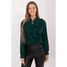 Tato elegantní dámská košile s klasickým střihem okouzluje výjimečným detailem širokým, plisovaným žabotem umístěným na přední straně, který jí dodává stylový a návštěvní charakter. Vyrobena z hladkého polyesteru, působí bezchybně a skvěle se hodí jak na každý den, tak do práce nebo na formální události. Model s standardní délkou má dlouhý, nafouklý rukáv, který dodává jemnou lehkost a ženský šarm. Výstřih s vázáním vytváří efektní zakončení a klasické zapínání na knoflíky zdůrazňuje nadčasový styl košile. Je to ideální volba pro ženy, které ocení eleganci v moderním provedení.