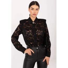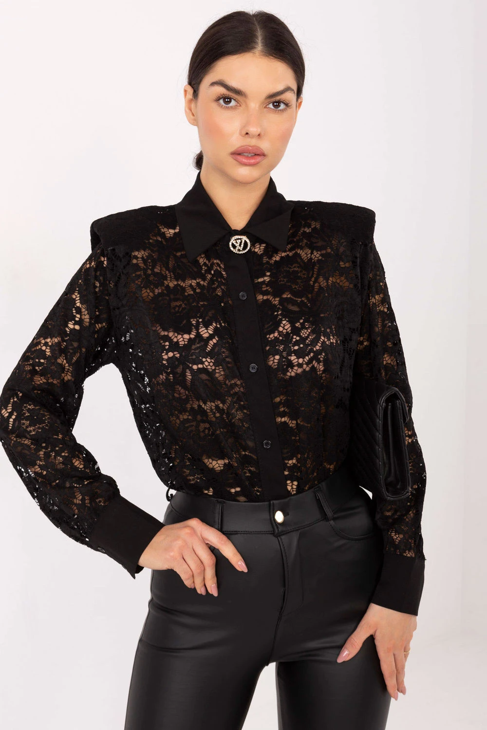 Elegantní krajková dámská košile vyrobená z jemné směsi polyesteru a viskózy okouzluje svým klasickým střihem a decentním krajkovým zpracováním. Vložené polštářky na ramenou dodávají postavě výraz a jemně zdůrazňují linii ramen, vytvářejíce estetickou, elegantní formu. Model s standardní délkou se skvěle hodí jak do práce, tak na společenské události. Košile má dlouhý rukáv a klasický límec, a zapínání na knoflíky zdůrazňuje její nadčasový charakter. Jako další ozdobný prvek je zde stylový brož, který dodává celku výjimečný, elegantní akcent. Krajkové detaily přidávají lehkosti a ženskosti, čímž tato košile je ideální volbou pro elegantní stylizace.