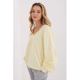 Každodenní volná blůza, ideální pro pohodlné a stylové outfity na každý den. Vyrobená z měkké bavlny s přídavkem elastanu, poskytuje pohodlí a dobře padne ke siluetě. Model s hladkým vzorem a standardní délkou má výstřih do V, který jemně zdůrazňuje krk a dodává ženský charakter. Dlouhé nadýchané rukávy jsou módním akcentem a dodávají blůze lehkost. Bez zapínání zdůrazňuje jednoduchý střih a pohodlnost nošení. Skvělý návrh pro každodenní, volné outfity.