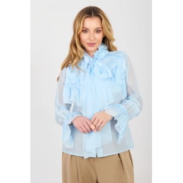 Elegantní dámská košile se stojkou, klasický model ideální na každý den, do práce a na společenské události. Vyrobená z vysoce kvalitní směsi tencelu a polyesteru, co zajišťuje měkkost, lehkost a pohodlí nošení, a zároveň elegantní, pečlivý vzhled. Model se standardní délkou vyniká hladkým vzorem, který zdůrazňuje její nadčasový charakter. Dlouhé rukávy zakončené volánem dodávají celému outfitu jemnou ženskost a jemnost, a stojka opticky prodlužuje siluetu a zdůrazňuje krk. Na přední straně košile je volán s vázáním, který je elegantním detail, dodávajícím šarm a jedinečný charakter. Košile má také zapínání na knoflíky, co usnadňuje její přizpůsobení a zachovává klasický střih. To je skvělý návrh pro ženy, které si váží kombinace elegance, pohodlí a jemných detailů v každodenních i společenských stylizacích.