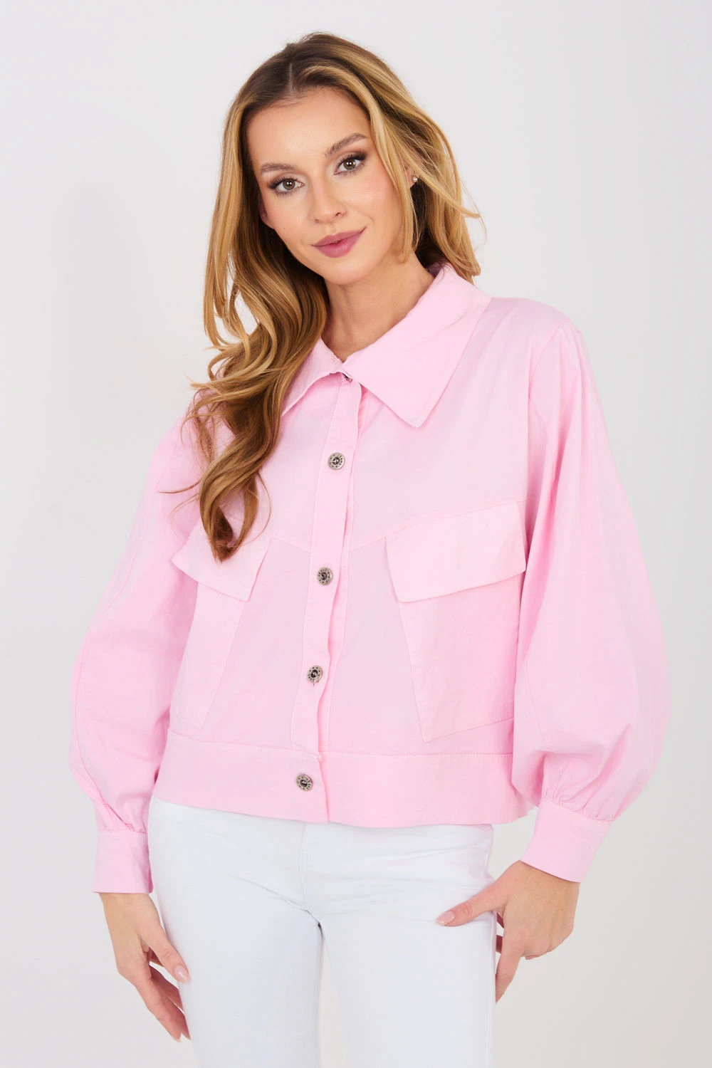 Dámská košile casualového stylu je stylovým a pohodlným návrhem pro každodenní outfit. Hladký střih dělá model univerzálním a snadno kombinovatelným s džíny, látkovými kalhotami nebo sukní. Krátká délka dodává košili moderní charakter a skvěle zdůrazňuje proporce postavy. Košile je vyrobena z vysoce kvalitní bavlny s přídavkem elastanu, díky čemuž je příjemná na dotek, prodyšná a jemně pružná. Model má klasický límec a zapínání na knoflíky, co zdůrazňuje jeho nadčasový styl. Dlouhé, nadýchané rukávy dodávají celku ženský a módní akcent. Praktickým a zároveň dekorativním prvkem jsou kapsy s lalůčky umístěné na přední straně, které dokreslují casualový charakter košile.