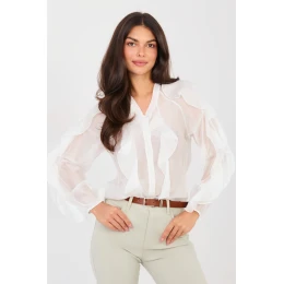 Elegantní dámská košile bez límce je stylovým návrhem, který skvěle kombinuje klasiku s moderní lehkostí. Skvěle se hodí jak na slavnostní události, do práce, tak i do každodenních elegantních stylizací. Hladký vzor jí dodává nadčasový charakter a usnadňuje kombinaci s jinými kousky oblečení. Košile je vyrobena z vysoké kvality tencelu s přídavkem elastanu, co zajišťuje měkkost, prodyšnost a pohodlí po celý den, a zároveň jemné přizpůsobení se postavě. Standardní délka zaručuje, že model vypadá skvěle jak nošený do kalhot, tak volně. Model má dlouhý, nafouklý rukáv, který dodává celku ženský a elegantní vzhled. Výstřih do V jemně zdůrazňuje krk a zeštíhlí postavu. Zapínání na knoflíky zdůrazňuje klasický charakter košile, zatímco volánky na přední straně a na rukávech tvoří efektní, dekorativní akcent, dodávající košili lehkost a výjimečný styl. Je to ideální volba pro ženy, které oceňují eleganci, pohodlí a propracované detaily.