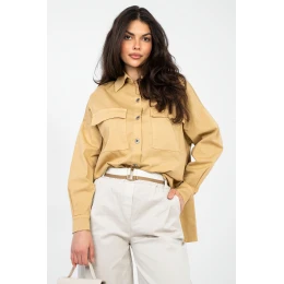 Univerzální dámská košile v casual stylu, ideální pro každodenní outfit. Vyrobená z příjemné bavlny s přídavkem elastanu, poskytuje pohodlí a volnost pohybu po celý den. Model má standardní délku s lehce prodlouženým zády, což dodává moderní charakter a skvěle padne na postavě. Hladký vzor umožňuje snadné kombinování s kalhotami nebo legíny. Košile má dlouhý rukáv, klasický límec a zapínání na knoflíky. Na přední straně jsou našity kapsy s patkami, které zdůrazňují casual styl a přidávají praktický prvek. Skvělá volba pro ženy, které ocení pohodlí, funkčnost a nadčasový design.