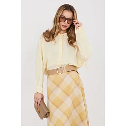 Dámská košile ve volném stylu, která se skvěle hodí jak do každodenních outfitů, tak do práce. Klasický hladký vzor dělá model univerzálním a snadno kombinovatelným s různými kousky oblečení, od elegantních kalhot po džíny. Košile je vyrobena z vysoce kvalitní směsi lyocellu, bavlny a lnu, díky čemuž je materiál lehký, prodyšný a příjemný na nošení. Standardní délka umožňuje nosit ji jak zasunutou do kalhot nebo sukně, tak volně. Model má klasický límeček a dlouhé rukávy, které zdůrazňují nadčasový charakter košile. Další výhodou je praktické šněrování na zádech, které umožňuje upravit šířku košile a lépe ji přizpůsobit postavě, zároveň dodává celku decentní ženský akcent.