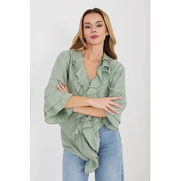 Dámská košile v boho stylu, která se skvěle hodí jak do každodenních outfitů, tak i do práce. Model se vyznačuje pestrou strukturou materiálu, která dodává celku zajímavý a stylový charakter. Košile je vyrobena z lehké a příjemné látky složené z viskózy a nylonu. Materiál je prodyšný, jemný k pokožce a dobře padne na postavě. Standardní délka umožňuje nosit košili jak zasunutou do kalhot nebo sukně, tak i volně. Model má výstřih do V s knoflíky a efektní límeček ve formě volánku. Přední část košile zdobí dekorativní žabot, který jí dodává romantický charakter. Dlouhé rukávy jsou zakončeny jemnými volánky, co zdůrazňuje lehkost a ženský boho styl. Jedná se o jedinečný návrh pro ženy, které ocení pohodlí spojené s originálním, módním designem.