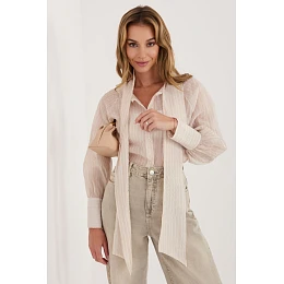 Košile dámská klasického střihu, která se skvěle hodí jak do každodenního nošení, do práce, tak i na více slavnostní události. Model standardní délky, zapínán na knoflíky, kombinuje nadčasovou eleganci s moderními detaily. Vyrobená z příjemné směsi lyocellu a polyesteru, poskytuje pohodlí a odolnost. Tkanina je zdobená decentním vzorem v jemných pruzích, který dodává celku lehkost a stylový charakter. Košile se vyznačuje nafouklými rukávy zakončenými širokými manžetami, které dodávají postavě výraznosti. Dalším benefitem je šněrování u krku, umožňující vytvoření elegantní mašle nebo volného uvázání podle příležitosti.
