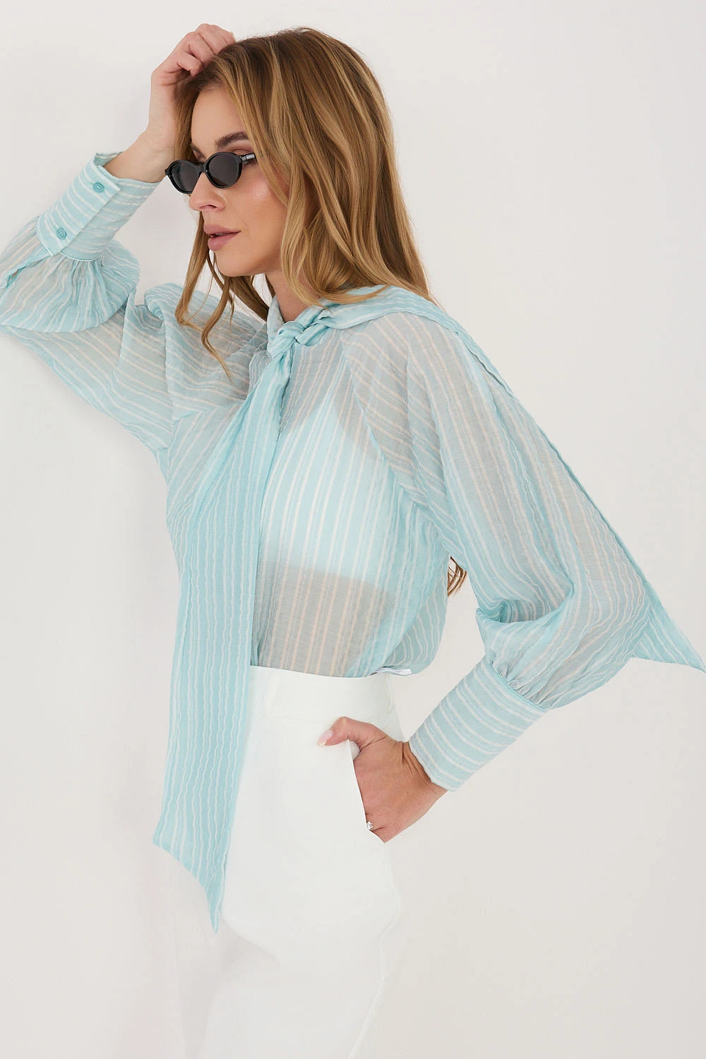 Košile pro ženy s klasickým střihem, která se skvěle hodí jak na každodenní nošení do práce, tak i na formální události. Model se standardní délkou, zapínáním na knoflíky, kombinuje nadčasovou eleganci s moderními detaily. Vyrobená z příjemné směsi lyocellu a polyesteru, poskytuje pohodlí a odolnost. Materiál je zdoben jemným vzorem drobných proužků, který dodává celku lehkost a stylový charakter. Košile se vyznačuje nafouklými rukávy s širokými manžetami, které dodávají postavě výraznosti. Další výhodou je šňůrování na krku, které umožňuje vytvoření elegantní mašle nebo volného uvázání podle příležitosti.