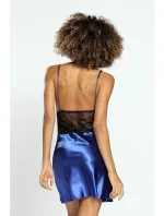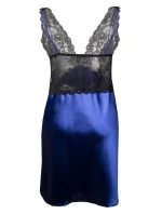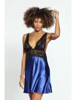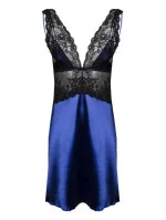 Elegantní tmavě modrá noční košilka s výraznou krajkovou vsadkou v černé barvě. Téměř poloviční podíl saténu a krajky umožnil dosáhnout v tomto provedení velmi smyslného efektu. Horní díl v podobě braletky, skrývá měkké košíčky s tenkými a nastavitelnými ramínky. Střední díl se svůdným průsvitným efektem. Spodní díl je volný, vzdušný a elegantní. Složení: 100% polyester.