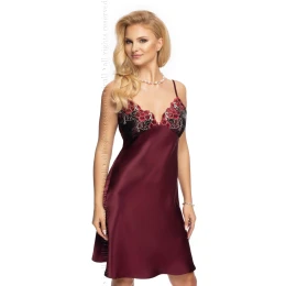 Elegantní noční košilka pro milovnice velmi módního saténu v tmavší švestkové barvě. Neuvěřitelně smyslná a velmi ženská. Košíčky zvýrazněné ozdobnou květinovou výšivkou. Velmi atraktivní střih, dole jemně rozšířený. Nastavitelná ramínka. 97 % polyester, 3 % polyamid.