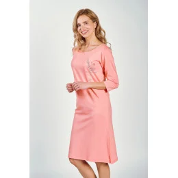 Dámská košile s 3/4 rukávy z jemné bavlny. Kulatý výstřih, jemný potisk na prsou, jemné řasení. Délka košile ke kolenům.