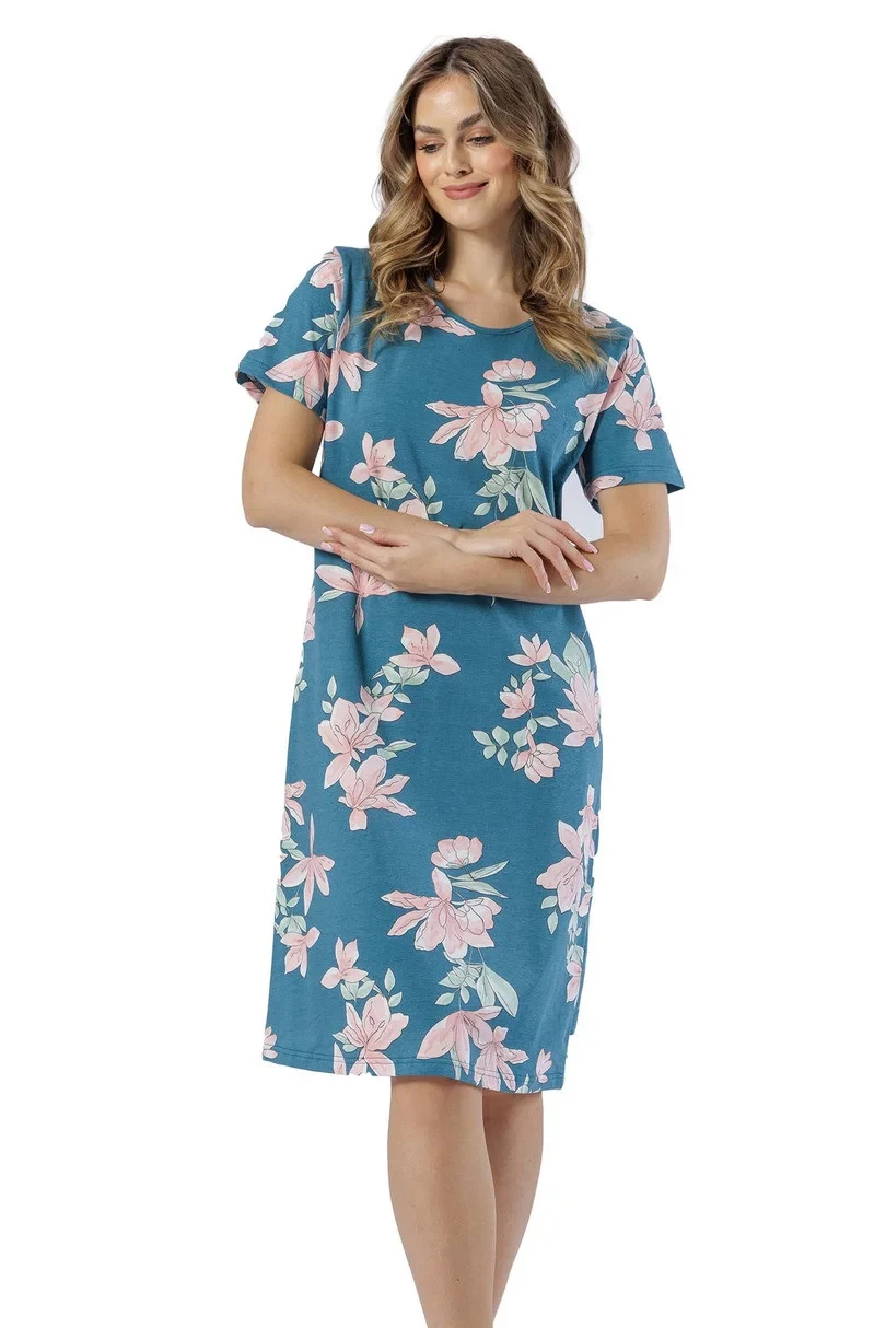 Dámské tričko s krátkým rukávem, z měkké bavlny s květy, kulatý výstřih, délka ke kolenům