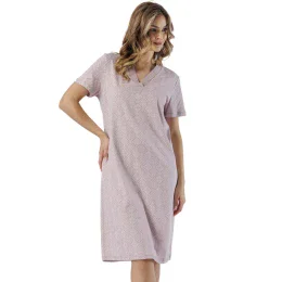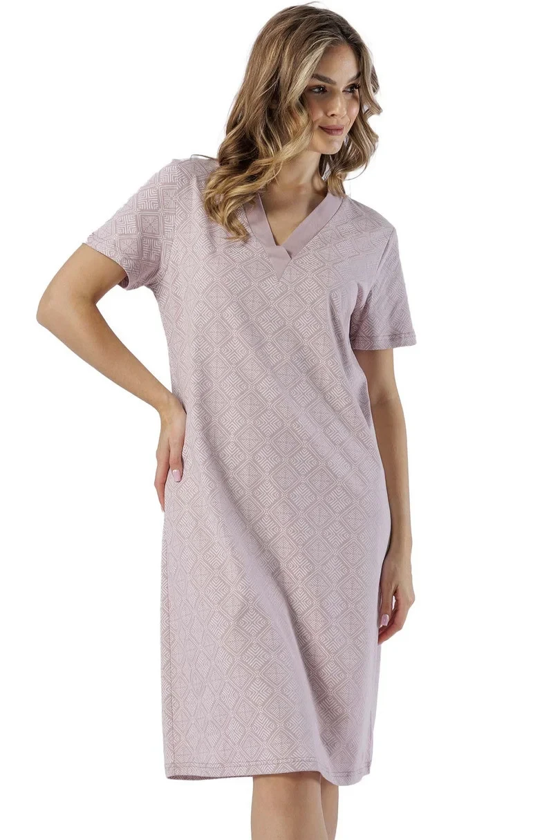 Dámské tričko s krátkým rukávem, vyrobené ze vzorované bavlny, s posádkovým výstřihem a kontrastním lemováním, délka ke kolenům.