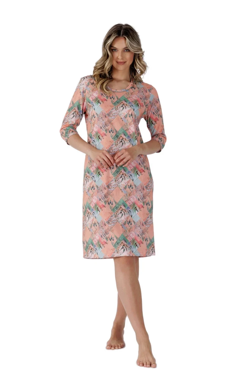 Dámská košile ušitá z jemné vzorované bavlny, s rukávy 3/4 délky. Kulatý výstřih, délka ke kolenům.