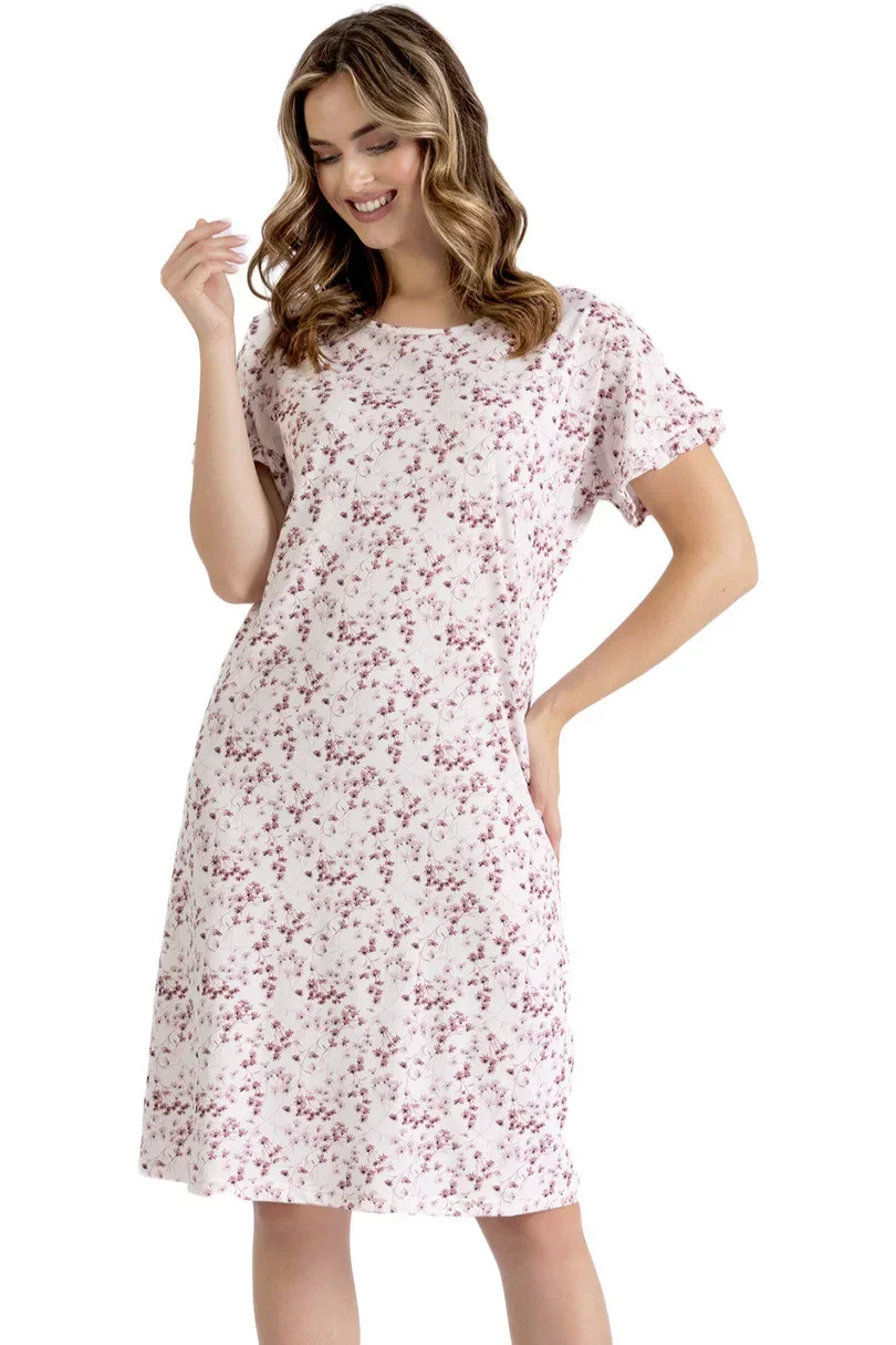Dámské tričko s krátkým rukávem ušité z kvalitní vzorované bavlny. Košilový rukáv zakončený volánem, délka ke kolenům.